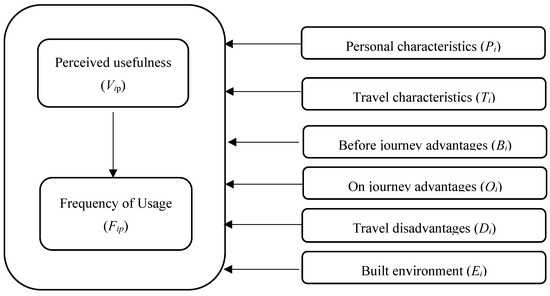 where Vi = perceived usefulness of the ride-sourcing by an individual i. The right-hand side of Equation (1) consists of the following: Pi = personal characteristics of individual i, Ti = travel characteristics of individual i, Bi = before-journey advantages using ride-sourcing of individual i, Oi = on-journey advantages using ride-sourcing of individual i, Di = travel disadvantage during travel by individual i, and Ei = built environment in individual i’s residence.