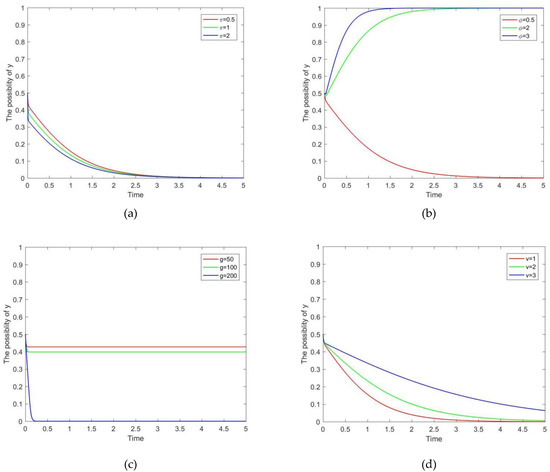 (4) When the value of the platform reward cost rises from 1 to 3 with a step size of 1, the probability of users choosing a behavior decreases slowly. Therefore, the more the platform pays for the cost of rewards, the more the platform’s effectiveness will decrease, and the probability of the platform taking incentive measures will decrease. This result shows that if the platform reduces the push for preference information to push mainstream value information, it is equivalent to paying a cost, and the platform’s attractiveness to users decreases. These results are shown in Figure 2d.