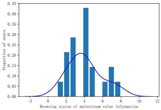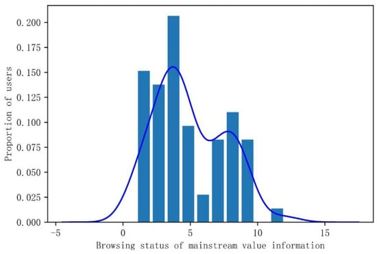 For the second type of users, Figure 4 shows multiple peaks, which partially obey the normal distribution but that generally do not obey the normal distribution. The reason for this is that different user groups have different age groups, living environments, and work needs, so the demand for mainstream value information is not the same. It can be seen from Figure 4 that 27% of users have viewed 7–9 pieces of mainstream value information. Among them, users between 50–70 years old accounted for 83% of this number. This result shows that mainstream value information receives more attention among the elderly.