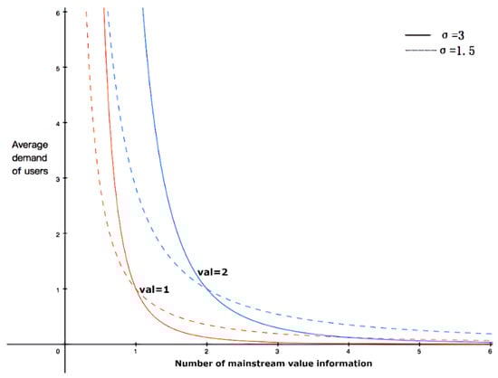 represents the evaluation factor of the news aggregation platform, which depends on the platform’s reputation, the quality of information, etc. The value represents the amount of mainstream value information on a page of the news aggregation platform. At present, the size of mainstream mobile phones is generally more than 6 inches. If we consider the default font size, each page of a news platform can generally display 3–6 pieces of information depending on the information type. In the experiment, we set the value range of between 0 and 6. It should be noted that the value of may be less than 1. For example, if the = 0.5, it means that every two pages pushes a piece of mainstream value information. As shown in Figure 3 and Figure 4, different user groups have different demands for mainstream value information, which means different user groups have different sensitivity levels to mainstream value information. As such, the parameter can indicate the sensitivity of the user group to mainstream value information.