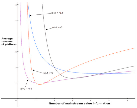 From the evolution of the game between users and news aggregation platforms and Figure 6, if news aggregation platforms blindly increase the push of mainstream value information, they can increase the revenue of such information in the short term. For example, if 1 and = 1.5 when > 1, then the platform revenue gradually increases. The reason for this is that it meets the demands of some users who prefer mainstream value information and increases the amount of information that they are exposed to, but because it reduces the push for preference information, it will cause the number of users of the news aggregation platform to decrease gradually in the long term.