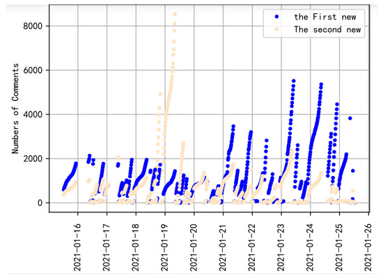 This paper takes Toutiao as the research object and uses the number of comments as an important indicator to evaluate user attention to mainstream value information. We obtained the first two pieces of information from Toutiao from 15 January 2021 to 25 January 2021. We took a sample every 15 min to obtain a total of 1624 valid data and used data visualization methods to draw a scatter chart of the data in time series (Figure 7), which can intuitively reflect the dissemination effect of mainstream value information.