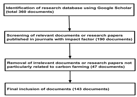 The literature was systematically reviewed based on the PRISMA (Preferred Reporting Items for Systematic Meta-Analysis) approach [26]. The research goals were investigated through related studies using Google Scholar with the keywords: carbon farming and soil management, carbon foot-printing and carbon economy, carbon sequestration, carbon farming and challenges. Further, the studies were investigated for the years 2000–2020. In total, 360 documents were analyzed, out of which 190 papers were found relevant for the present review (Figure 1). Finally, the research papers published in journals with an impact factor were carefully selected, and their findings are reported in this review.