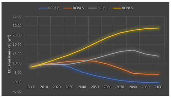 Furthermore, agricultural operations need adequate monitoring so that farmers can make informed decisions regarding equipment and use of fuel and soil carbon changes [129]. Organic farming frequently has a lower carbon footprint (CF) than conventional agriculture when measured by area and sometimes by-product unit [121]. The future use of certified organic farms as a longitudinal national or global population study would be justified due to their potential benefits and the annual inspection and certification process. In this direction, the representative concentration pathway (RCP) is a GHG concentration trajectory approved by the Intergovernmental Panel on Climate Change (IPCC). In 2014, the IPCC’s fifth assessment report took four distinct climate modelling and research [130]. The paths illustrated possible climate futures, and each is considered plausible considering CO2 generated in the coming years. RCP2.6, RCP4.5, RCP6.0, and RCP8.5 refer to radiative forcing values for the year 2100 (Figure 2).