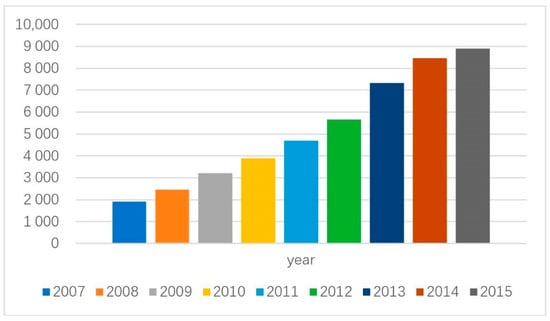 We collected the data of cooperative patents applied for by organizations in China between 2007 and 2015 from China National Intellectual Property Administration (https://www.cnipa.gov.cn). There are 46,492 cooperative patents contained in these data. Figure 1 shows the number of patent applications per year. As can be seen from Figure 1, the number of cooperative patents applied for by organizations in China shows an increasing trend year by year.
