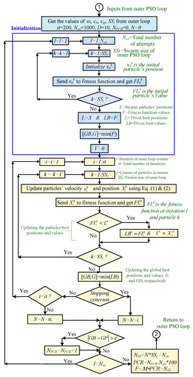 The concept proposed in this study can be applied to all the PSO parameter estimation strategies, where it can be used with fixed PSO parameters, dynamic PSO, and adaptive PSO parameter variations. Moreover, this strategy can be used to determine the optimal parameters for all metaheuristic techniques. The proposed strategy for PSO control parameter (ω, cl, and cg) determination is called the nested PSO (NESTPSO). The term nested PSO has been introduced in many researches [38,39,40,41,42,43,44] to handle certain functions. However, it has been used in this paper to determine the control parameters of PSO or any other metaheuristic techniques. All the previous studies depended on non-autonomous strategies to estimate the control parameters of the PSO. Two nested PSO searching loops are used, where the inner PSO loop contains the fitness function required to be optimized. The outer PSO loop uses the inner PSO as a fitness function to minimize the PCR and NSS. The PSO parameters of the inner loop (ωi, cli, and cgi) and swarm size (SSi) are used as the variables to be optimized in the outer loop. The outer PSO loop control parameters’ values are given in [20], where ωe = 0.729, and cle = cge = 1.49445. The swarm size of the outer loop is chosen to be equal to 50 particles. A block diagram showing the logic used to determine the optimal values of control parameters in the NESTPSO is shown in Figure 1 and Figure 2 for the outer and inner PSO loops, respectively. At the beginning of the iteration process, the outer PSO loop initiated random values for the control parameters and the swarm size of the inner PSO loop. These values are applied to the inner PSO loop to minimize the benchmark mathematical functions used in this study. To avoid the effect of the random nature inherent in the inner PSO loop, the function is minimized for a certain number of iterations, Nav, to obtain the average results. After performing Nav iterations for the inner loop, the times the inner loop is trapped in the local optima are counted as a variable NPCR and the PCR is determined from (3). The number of average iterations in the inner loop, Ni, is determined and used to determine the average value of NSS, as shown in (4). The multi-objective function is determined in terms of PCR and NSS, as shown in (8), to get the optimal PSO parameters of the inner function for minimum PCR and NSS. These two parameters displayed opposite performance, which means to get minimum PCR, NSS had to be increased, and vice versa. Therefore, the multi-objective function shown in (8) is introduced to achieve a trade-off between these two factors.