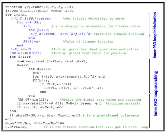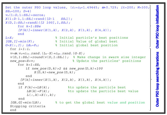 Minimizing the objective function, F in the outer PSO loop guaranteed optimal PSO control parameters and swarm size of the inner loop for minimum PCR and NSS. The optimal values of the control parameters of the inner loop are obtained as the optimal solutions for the outer loop. The detailed pseudo-code explaining this new strategy (NESTPSO) for obtaining the optimal values of the PSO control parameters is shown in Figure 3 and Figure 4 for the outer and inner loops, respectively. It is clear that the control parameters and the swarm size of the inner PSO loop are fed from the outer PSO loop as optimized variables. The concept of using the NESTPSO in the determination of the parameters of metaheuristic techniques has not been reported in the literature before. The proposed strategy can be used as an on-shelf optimal parameter estimation for any metaheuristic technique, which will assist researchers and designers to use their proposed metaheuristic techniques with optimal performance. This new strategy ensures fast and reliable convergence for any fitness function used with any metaheuristic technique. The proposed strategy will open a new way for the optimal determination of metaheuristic techniques parameters estimation and other applications.