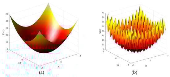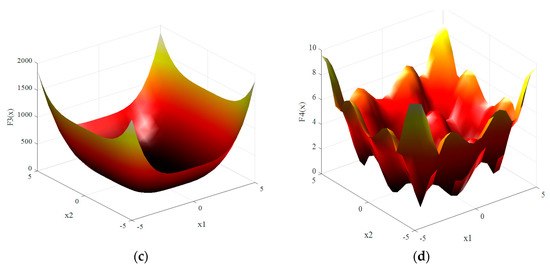 The four selected benchmark mathematical functions have zero minimum value. These benchmark functions are shown in the following Equations (9)–(12). The order of these benchmark functions is set at D = 10. These function are drawn in Figure 5 for two dimensional order (D = 2).