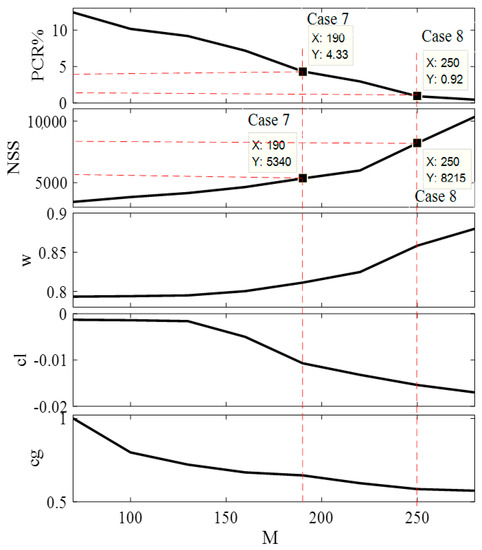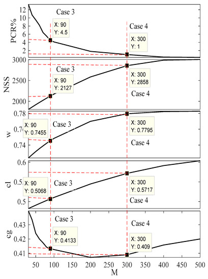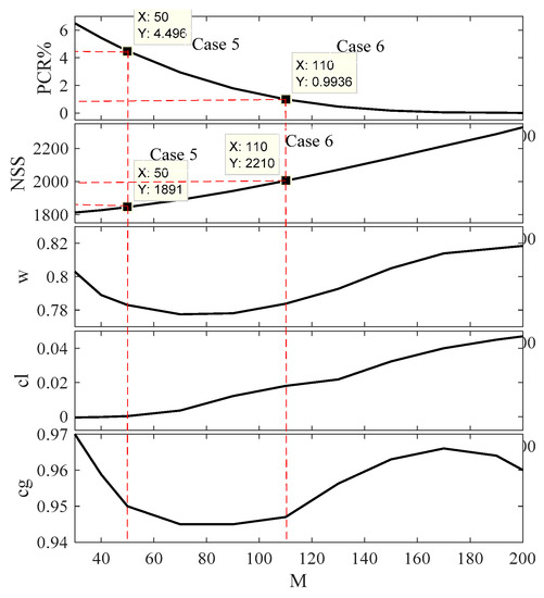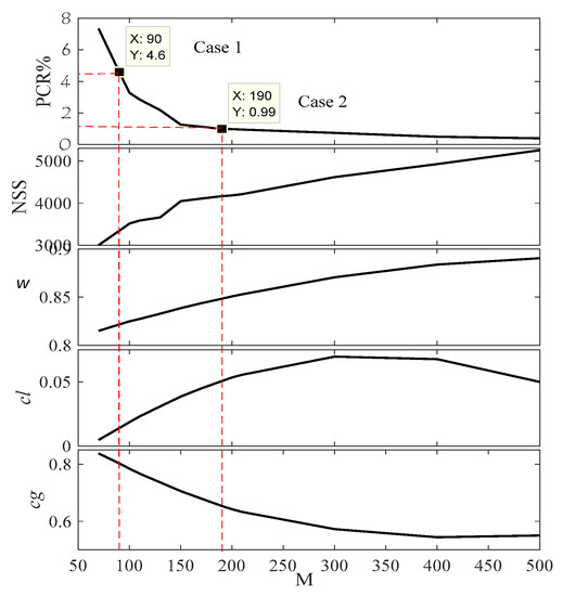 The experimental work for the Alpine Benchmark function is performed to determine the weight of the multi-objective function, M. The variation of the control parameters of the inner loop (ωi, cli, and cgi), PCR, and NSS, along with M are shown in Figure 12, Figure 13, and Table 4. It is clear from the figure that the value of M is inversely proportional to PCR and directly proportional to NSS in the lower values of M; however, it saturates after M increases. It is clear that the maximum value of PCR is 12.42 at M = 70. This value is lower than all the state-of-the-art strategies. The value of M can be selected based on the lowest value of PCR, where if PCR <= 5% (Case 7) is the acceptable value, the selected value of M = 190; the values of ωi, cli, cgi, SSi, PCR, and NSS are 0.8113, −0.0107, 0.6583, 47%, and 5340, respectively. If the acceptable value of PCR <= 1% (Case 8), the selected value of M = 250; values of ωi, cli, cgi, SSi, PCR, and NSS are 0.8585, −0.0154, 0.5761, 50, 0.92%, and 8215, respectively. These two cases are further compared to the state-of-the-art strategies to show the superiority of NESTPSO. The difference between these two cases is that Case 8 needs an extra 2875 hitting the fitness function to reduce the PCR from 4.33% to 0.92%. This implies that Case 7 is faster than Case 8, but with a higher PCR (failure rate).