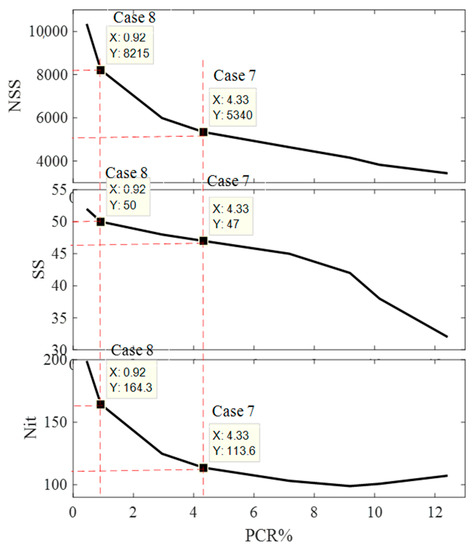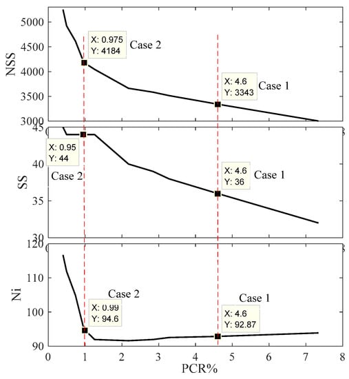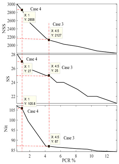 The variation of M, with the control parameters of the inner loop (ωi, cli, and cgi), PCR, and NSS are shown in Figure 6 and Table 1. The objective of this section is to determine the optimal value of M shown in Equation (8). It is clear from Figure 6 and Table 1 that the maximum value of PCR is 7.34 at M = 70. However, this value is lower than the best value obtained from the state-of-the-art strategies [8,9,10,11,12,13,14,15], as shown in Table 5. Additionally, it is clear that the value of M is inversely proportional to the PCR and directly proportional to the NSS in the lower values of M; meanwhile, it shows a saturated relation with the higher values of M. The variation of SSi, Ni, and NSS with the value of PCR is shown in Figure 7. For best operating performance, the PSO should have the minimum value of PCR and NSS. Here the PCR is inversely proportional to M, and NSS is directly proportional to M. Therefore, a trade-off between these two values is required. The value of M is selected based on the acceptable lowest value of PCR, where, if PCR <= 5% (Case 1) is the acceptable value, the selected value of M = 90, and the values of ωi, cli, cgi, SSi, PCR, and NSS are 0.8216, 0.0140, 0.803, 36, 4.5%, and 3342, respectively, as shown in Figure 6, Figure 7, and Table 1. Meanwhile, if PCR <=1% (Case 2) is the acceptable value, the selected value of M is equal to 190; the values of ωi, cli, cgi, SSi, PCR, and NSS are 0.8484, 0.0506, 0.6538, 44, 0.98%, and 4162, respectively. These two cases are further compared to the state-of-the-art strategies [8,9,10,11,12,13,14,15] to show the superiority of NESTPSO. The difference between these two cases is that Case 2 required an additional 820 hitting the fitness function to reduce the PCR from 4.5% to 0.98%.