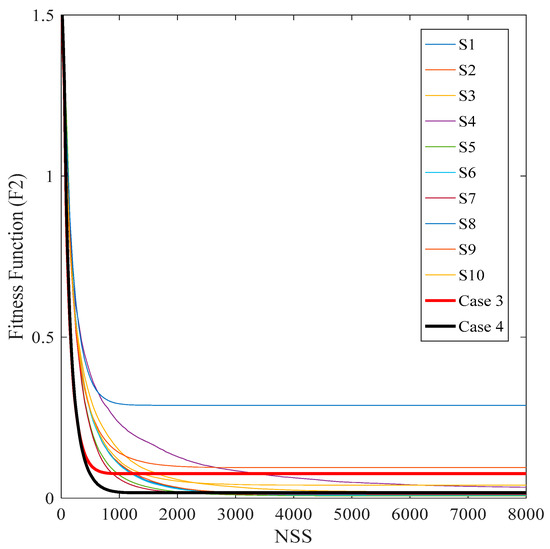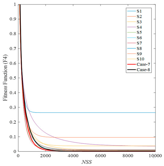 After studying the performance of the NESTPSO with the variation of M in the previous section, two values of M are selected for further study and comparison in each benchmark function under study. The selection of M depends on the allowed PCR, as has been discussed. The PSO control parameters of state-of-the-art strategies have been used to determine the PCR and the NSS, to be compared to the values obtained in Cases 1–8, as discussed in Section 3.4. The following list is summarizing the different cases understudy: