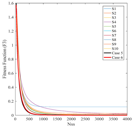 The experimental work for the De Jong benchmark function is performed in the beginning to determine the weight of the multi-objective function, M. The variation in M with the control parameters of the inner loop (ωi, cli, and cgi), PCR, and NSS are shown in Figure 10 and Table 3. It is clear from this figure that the maximum value of PCR is 6.5059% at M = 30. The value of PCR reduces swiftly with variation in M compared to the other two benchmark functions. The value of M is selected based on the lowest value of PCR, where, if PCR <= 5% (Case 5) is the acceptable value, the selected value of M = 50; values of ωi, cli, cgi, SSi, PCR, and NSS are 0.783, 0.003, 0.9501, 29, 4.496%, and 1891, respectively. If PCR <= 1% (Case 6) is the acceptable value, the selected value of M = 110; values of ωi, cli, cgi, SSi, PCR, and NSS are 0.7838, 0.018, 0947, 42, 0.9936%, and 2210, respectively. These two cases are further compared to the state-of-the-art strategies to show the superiority of NESTPSO. The difference between these two cases is that Case 6 required an extra 319 hitting the fitness function to reduce the PCR from 4.496% to 0.9936%. The results of this experiment are shown in Table 3. Negative values of cli are observed for the first time in the literature. Figure 11 shows the variation in SSi, Ni, and NSS along with PCR.