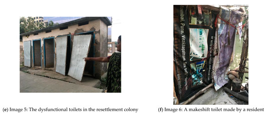 This sub-section assesses the dwellers’ quality of life in the resettlement colony as an important parameter of inclusiveness. Excerpts of the interviews and observations show that the resettlement colony was constituted of typical one-room huts made of tile and with a plastic-covered roof, located adjacent to a high drain, carrying pitch-dark sludge and a breeding ground for mosquitoes (Figure 3a–d). Seventy-two resettlement units are concentrated on a small block of land between the main road and the high drain. Due to the lack of space, some households are extending their activities to the road, which is dangerous, and accidents have occurred. The toilets are located at both ends of the stretch of huts (Image e), but a lack of maintenance has left only one of them in proper operating condition. To avoid any inconvenience caused from it, some dwellers have made makeshift toilets outside their huts (Image f). There is no individual water supply line to households. Water has one point source and needs to be carried from there to parts of the colony. Sabita (34), a female resident of the resettlement colony, notes, “We were much happier in the China Mandir ground in Nonadanga. There was more space, and it was comfortable. Here, there is no space to move. We have been cramped up in these huts in the name of resettlement”. The smell from the high drain cannot escape visitors’ olfactory senses. Even though they have got used to the smell, the residents mention it becomes unbearable after rain. “The government has indeed resettled us, but you see how we are living”, says Soma (25). She adds, “My children cannot go out; the road is too busy and risky. Can you see there (pointing to the roof), the hut is slowly tilting towards the high-drain? We do not know how safe it is for us to live here”. Moreover, there is a constant risk of malaria and other diseases in the colony. The threat of another eviction is not ignored by the dwellers, who mention a plan of converting the land on which the resettlement colony stands into a parking lot by the Honda showroom located across the road. They came to know about this plan from an advertisement by Honda showing a parking lot in the place of the colony, which was removed after resistance from the dwellers. The quality of the infrastructure in the resettlement housing and threats of eviction expose the inclusiveness rhetoric practiced by KMC.