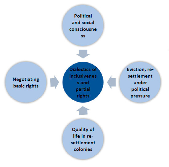 The actual nature of the dialectics of inclusiveness as practiced by the urban governance system in Kolkata is presented in the section above with evidence from the field. This paper identifies the contradictory situation of inclusion as well as exclusion as partial rights, where the subaltern migrants of Nonadanga on Kolkata’s urban fringe live in conditions of partial rights. Their rights are partial because the dialectic stance of governance agencies maintains the status quo in urban migrants’ overall quality of life (Figure 5). In Nonadanga, the urban migrants were given occupancy rights, which entail citizenship rights, by formally enrolling them into the electoral process. Despite this, there is little or no improvement in their living conditions and environment. Social and political exclusion continues to operate as those in power use their subaltern identities for political gains. In the case of Nonadanga, this was achieved by creating the spectacle of resettling evicted migrants. The resettlement, however, did not ensure a basic quality of life. From a long-term sustainability and inclusiveness perspective, people living under partial rights conditions are excluded from a basic quality of life and, thereby, holistic inclusiveness. Citizenship rights do not ensure secured occupancy rights or an improved quality of life, preventing them from living the dialectic life of a citizen, as a disenfranchised migrant in Kolkata.
