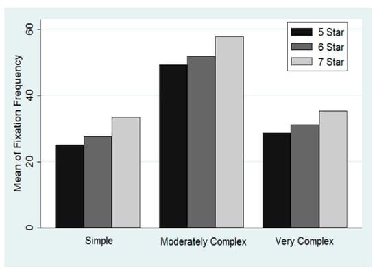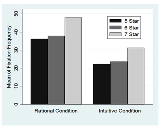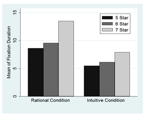 Further, to verify Hypotheses 1a and 1b, the average total viewing time and average number of fixations for each stimulus were calculated by computing the means of the summed fixation durations and how many times a participant’s gaze paused on the given area of each group (rational vs. intuitive), respectively. Results of the mixed MANOVA revealed significant main effects of condition (F (1, 58) = 20.32, p = 0.003 < 0.01, 1 −  = 0.70) and average rating (F (2, 58) = 5.50, p = 0.003 < 0.01, 1 −  = 0.64), but no significant interaction between the two variables (F (1, 60) = 1.00, NS). Figure 2 and Figure 3 show the differences in the average total viewing time (unit: seconds) and average number of fixations between the two conditions for each level of average ratings. The results suggested that the average total viewing time ( vs. , t (28) = 5.83, p = 0.004 < 0.01, 1 –  = 0.70) was significantly longer and the number of fixations ( vs. , t (28) = 5.48, p = 0.003 < 0.01, 1 −  = 0.60) was significantly greater in the rational condition than those in the intuitive condition. Hypotheses 1a and 1b were therefore supported.