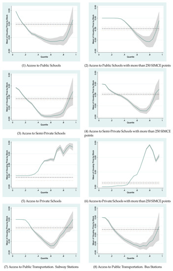 Panels 7 and 8 show the quantile coefficients’ behavior for the accessibility to public transportation: bus and subway stations. In this case, I find a U-shape in the accessibility to buses following the same pattern as public schools; lower and higher income groups are suffering a lack of accessibility for these services. In particular, two facts might explain this shape. First, most low-income and high-income households are located on the outskirts of the MR, and both groups could be suffering problems concerning the insufficient route coverage that exists outside the city’s central areas. However, only wealthy families have higher probabilities of possessing cars, which allows them to benefit from highway systems. Higher-income groups can switch from public transportation to private vehicles, overcoming the commuting constraints that disadvantaged individuals must handle to accessing central areas. Additionally, medium-income groups have more access to subway stations. From this analysis, I can confirm that housing location is still relevant in determining access to local public services; subway stations are mainly designed to connect the central areas of the MR, where commercial activities are located. Considering that housing prices also respond to these kinds of activities, we expect high access to subway stations due to high housing prices.