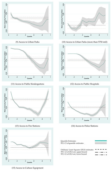 Panels 9 and 10 show a different behavior regarding accessibility to urban public parks. In panel 9, it is possible to observe a similar effect of housing prices on urban public parks. In terms of supply, urban public parks’ distribution is more equitable between income groups than other local public services. However, if I consider only urban public parks with a surface over 5750 square meters, the behavior of coefficients by quantile follows the same pattern as private services (e.g., private schools). This surface represents the mean of green area size at the MR. Therefore, accessibility to larger urban parks is still determined by housing prices because the access is higher when housing prices are higher, reflecting their unequal distribution regarding the most impoverished population. The current Chilean regulation of urban areas can offer a possible explanation; it does not define a minimum size for a park, but only the obligation of using a percentage of urbanized land to build parks. In this way, developers can assign small proportions of land to urban parks because it is impossible to build more affordable housing and, therefore, small green areas proliferate without considering the population density of locations (Reyes and Figueroa, 2010) [40]. Consequently, the provision of urban parks is unequal and insufficient across neighborhoods with few large parks concentrated and closer to high-income groups.