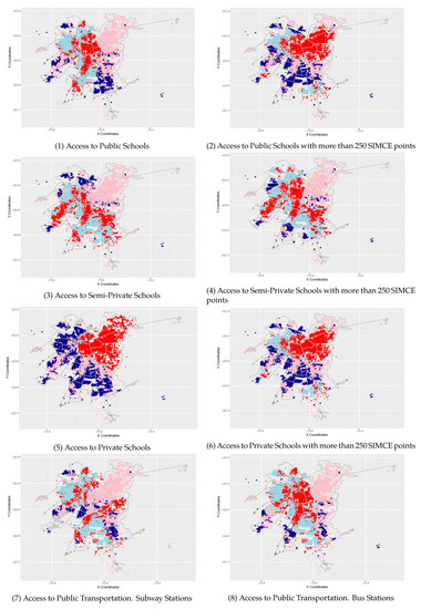 On the contrary, low-income groups located in the MR’s southern areas suffer significant disparities in accessing high-quality public schools. This situation determines that lower-income groups are excluded from these services, which reduces their probabilities for accessing better education opportunities than households located in the center and northeast areas. Considering that high-income groups are more likely to choose the private version of schools characterized by high-quality performances, these results confirm that residential segregation patterns are reinforced by low accessibility levels to public schools, excluding the most deprived communities from high-quality public services. This situation reveals that the urban space in MR is not only segmented by the stratification of communities. Additionally, the unequal distribution of accessibility levels can exacerbate this shape, with relevant differences in terms of well-being or capitalizations of public services into housing prices. Figure 3, panels 5 and 6 show the bi-variate LISA for private schools, where high-income groups are receiving more high-quality services than low-income groups.