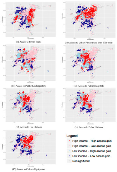 A similar spatial distribution is also observed for urban parks. Panel 9 shows that high-income groups receive higher levels of accessibility to public urban parks than lower-income groups located in the MR’s southern areas. Larger parks exacerbate this situation (panel 10). Higher levels of accessibility to urban parks are available to high-income areas, and lower-income groups located in the northwest and southern part of the MR are marginalized from these types of urban parks. Finally, LISA maps for other local public services, such as transportation, kindergartens, healthcare centers, fire stations, police stations, and culture infrastructure, confirm that lower-income groups receive fewer proportions of local public services. These groups are located mainly in the southern and northwest areas of the MR. This evidence supports the idea that residents’ location is strongly associated with local public services’ spatial distribution patterns, which might have significant consequences in migration decisions exerted by individuals. In this case, residential segregation patterns are marked and exacerbated by the unequal distribution of local public services across the MR. This implies low access for the most impoverished population by excluding them from enjoying better living standards or opportunities to have access to essential services such as schools, hospitals, or transportation.