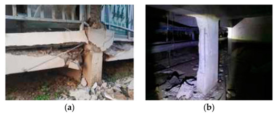 Separated joint, impact fracture, joint fracture, and short column fracture in the Daeseong apartment complex. (a) Separated joint, impact fracture; (b) Short column fracture on the basement floor.