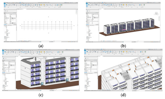BIM modeling of the Daeseong Apartment Complex through reverse engineering of 3D geometry. (a) Grid setting for the BIM modeling of Building E; (b) BIM modeling of Building E; (c) Elevation of Building E; (d) Sectional view of Building E.