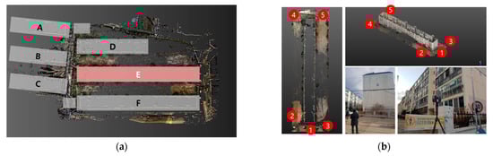 Field design for scanning the Daeseong Apartment Complex. (a) Location of Building E in the Daeseong Apartment Complex. A–F is the number of buildings in apartments; (b) Scanning measurement locations and on-site analysis. ①–⑤ is measurement points of the 3D scanner in on-site.