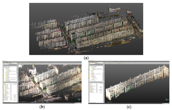 Analysis using only 3D scanning data. (a) Point cloud data for the Daeseong Apartment Complex; (b) Acquisition of point cloud data; (c) Extraction of Building E data.