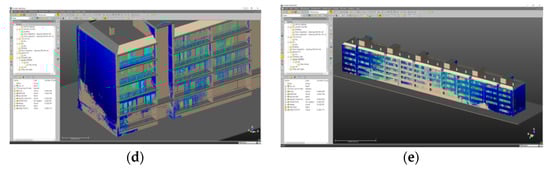 The blue color shown in Figure 6 is the point cloud obtained by scanning the building E of the Daeseong Apartment Complex, therefore representing the actual damage after the earthquake. The gray color reflects the undamaged status through a BIM model based on the 2D drawings. Figure 6d,e shows the result of combining the two kinds of data, and the colored part shows a mismatch.