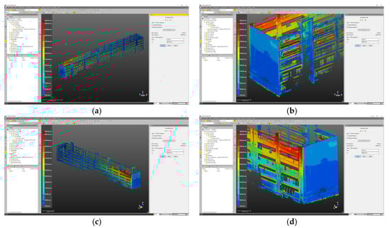 3D inspection using the point cloud and BIM data. (a) Entire 3D inspection; (b) Front 3D inspection; (c) Rear 3D inspection; (d) Rear 3D inspection in detail.