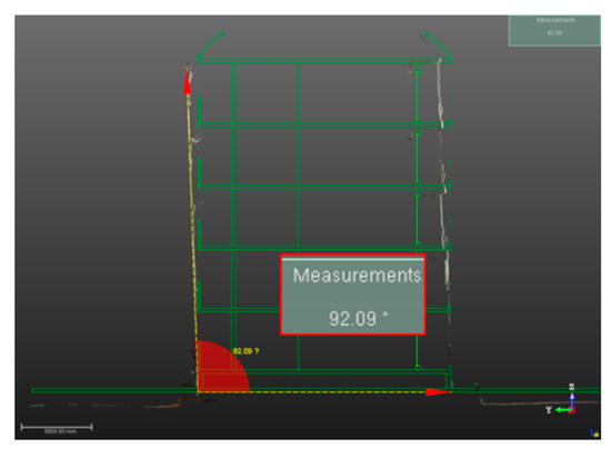 The lines of the desired cross-sectional areas were extracted from the BIM data, and the overall slope of the building was measured by comparing them with the point cloud data. The above wall smoothness analysis results revealed a significant change in the displacement of the west wall, which shows that the building was inclined backward. Therefore, the side slope of the building was analyzed in detail as shown in Figure 10.