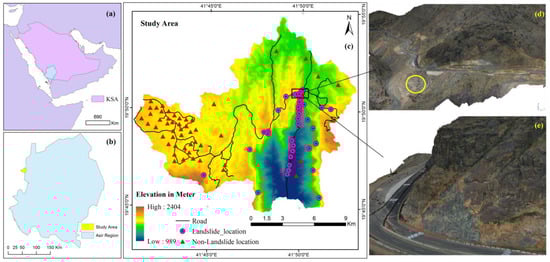 Showing the study area and landslide locations: (a) country boundary of Saudi Arabia with Asir region; (b) Asir region boundary with the study area location; (c) the study area, landslide locations and non-landslide location and (d,e) 3D model of landslide site (yellow circle showing landslide-prone area).