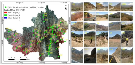 Showing some field photographs with corresponding point locations for soil sample collection sites and landslide locations in the study area.