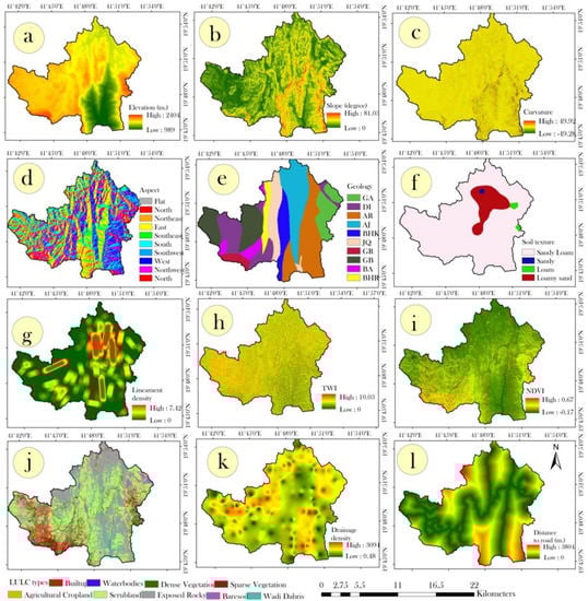 Showing the landslide triggering factors, such as (a) elevation, (b) slope, (c) curvature, (d) aspect, (e) geology, (f) soil texture, (g) lineament density, (h) topographic wetness index (TWI), (i) normalized differentiation vegetation index (NDVI), (j) land use land cover (LULC) types, (k) drainage density, (l) distance to road.