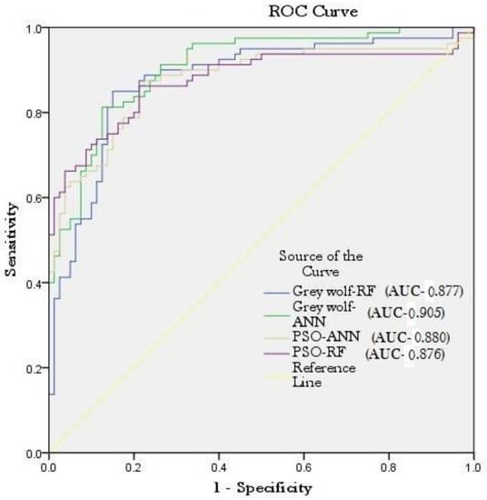 In the present study, the grey wolf and PSO optimization were applied to obtain the best structural parameters of the mentioned machine learning algorithms. The ensemble procedure for the proposed GW-ANN, GW-RF could be as follows: parameters initialization of GW optimization→ initialize the random position of “n” grey wolf in “d” dimension→ find the fitness value of wolf→ stopping criteria met? if it does not met, starting again from the second stage→ update the position of wolf→ calculate the fitness of the wolf→ find the value of alpha, beta, and delta’s position→ stopping criteria met? If met, then starts with the training of machine learning algorithms→ evaluate the accuracy→ meeting stopping criteria? If yes, then the optimal model is obtained. If not meet the stopping criteria, then starts again with the second steps of GW optimization. The ensemble procedure for the proposed PSO-ANN, PSO-RF could be as follows: parameters initialization of PSO algorithm→ training and testing of machine learning algorithm with the initialized parameters→ calculation of fitness function→ fitness value of each swarm of particle in reference to local and global best values→ updating the velocity and position of each swarm of particle accordingly→ reaching a maximum number of iteration? If not reached, starting again from the second stage→ if it reached the maximum number of iteration, that would be the optimal parameters for the machine learning algorithms.