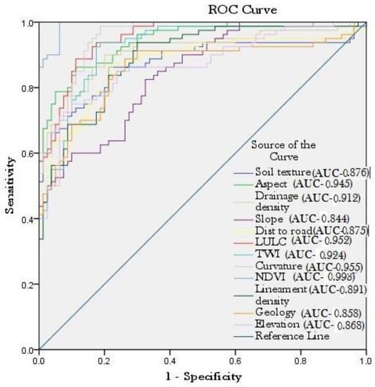 The ROC curve is a common and popular technique worldwide for evaluating the landslide susceptibility maps [,,,,,,,,]. In ROC, the false-positive rates and true-positive rates are presented on the X and Y axis, respectively []. It distinguishes the trade-offs between two rates. In ROC, the value of area under the curve ranges between 0 and 1.0. Higher the AUC value, higher the accuracy of the model or higher the agreement between the predicted models and ground reality. Talukdar and Pal [] pointed out that the AUC value higher than 0.70 reflects a good agreement between the predicted model and the ground reality.