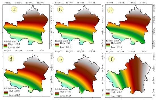 The landslide hazard modeling is considered as the probability of landslide occurrences within the particular space and time, which damages various resources, lives, and properties. However, the landslide hazard modeling needs to have two important factors, such as landslide susceptibility map and temporal landslide conditioning factors, such as rainfall, snowfall, and earthquake []. The present study area observes extreme and average rainfall-induced landslides, therefore, abnormal or extreme rainfall is considered as the major landslide triggering factors. Thus, to construct a landslide hazard model, the extreme or abnormal rainfall was estimated using Gumbel extreme value distribution method []. A variety of statistical techniques are available for estimating the rainfall at return periods, such as weibull, log-pearson type-III. Researchers reported that Gumble extreme value distribution provides a better performance for regions with medium to low rainfall []. The study area observes medium to low rainfall. Therefore, the Gumble method is suitable for estimating rainfall. The rainfall at 2, 5, 10, 20, 50, and 100 years return period were estimated by analyzing the long-term rainfall (1973–2019). The study area has evenly distributed four rain gauge stations. The study area observes quite similar amounts of rainfall in all gauge stations. Therefore, the inverse distance weighting (IDW) technique can perform good results like kriging under these circumstances. Thus, in the present study, the IDW was employed for preparing interpolated rainfall layers. Spatiotemporal landslide hazard maps were constructed by combining the rainfall layers at different return periods and landslide susceptibility maps following Equation (3).