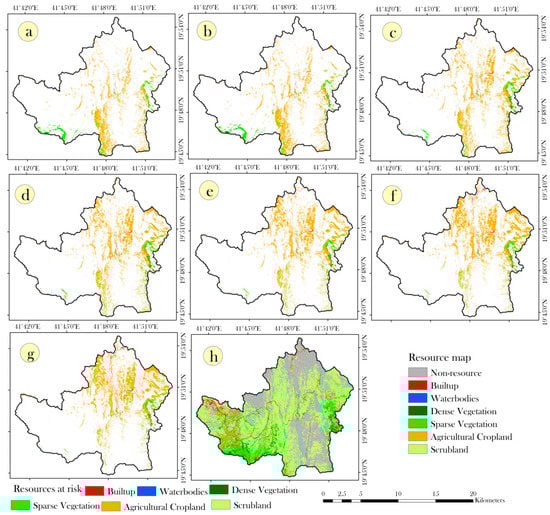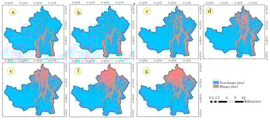 In order to construct spatiotemporal LRA in data scares regions, the concept of the danger pixel and resource map were employed as a semi-quantitative approach. The resource map was generated from the LULC map. Generally, the bare soil, exposed rocks do not provide goods and services; therefore, these classes are considered as non-resource from a monetary point of view. The resource map includes water bodies, sparse vegetation, dense vegetation, built-up area, spruce land. Then, the danger pixel was identified for further research. The pixels having the very high and high landslide susceptibility zones and landslide hazards are considered as the danger pixel because these pixels have the highest chances to have landslide hazard in future, while in the past, these pixels had observed landslides. Therefore, in the present study, we utilized the danger pixel for LRA by following Kanungo et al. []. To construct spatiotemporal danger pixel maps, the landslide hazard maps at different return periods were considered. Subsequently, spatiotemporal landslide hazard maps were reclassified into two classes, such as danger pixel and non-danger pixel. For mapping the danger pixel, very high and high landslide hazard zones were merged into one class, i.e., danger pixel. While, rest of the classes, such as very low, low, and moderate landslide hazard maps were merged into one class, i.e., non-danger pixel. In this way, we prepared danger pixel maps for 2, 5, 10, 20, 50, and 100 year return periods.