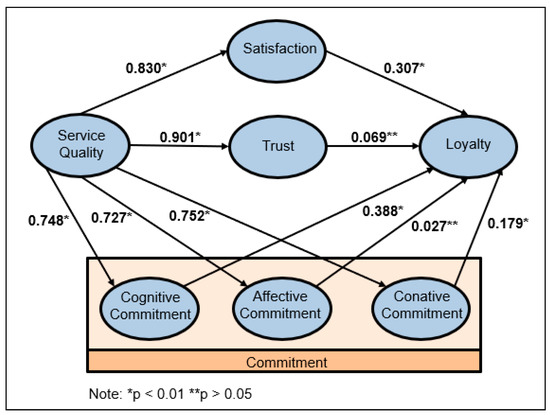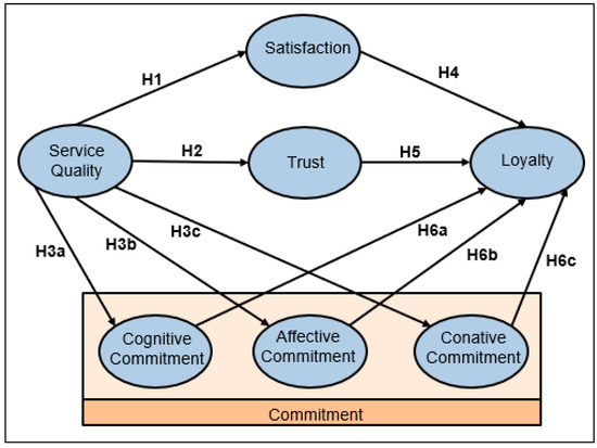 The questionnaire included multiple-item measurement scales adapted from the review of the literature that help to ensure the validity of measurement scales for all constructs: five items for service quality [24,62,65,66], three for loyalty [62,140], three for satisfaction [62], four for trust [62,89,156,158], two for affective commitment [85,110,118] two for conative commitment [104] and two for cognitive commitment [108,109,111] (See Table 3).