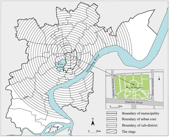 The firsthand data come from the second, third, fourth, fifth and sixth censuses in 1964, 1982, 1990, 2000, and 2010, respectively. In order to study urban growth and the spatio-temporal evolution of the urban geographic system, the data of population by sub-district are transformed into those by spatial distribution. The data are dealt with according to the following four steps. (1) Adjust the boundaries of each sub-district according to historical materials and records. We obtain the map with spatial boundaries of sub-districts of Hangzhou in the four years from various sources of local governments and numerous field trips. To get the population of sub-districts whose boundaries are definite, some sub-districts are merged, according to the changes of the boundaries of sub-districts in 1964–2010. (2) Calculate the population density of each sub-district in the five years (i.e., 1964, 1982, 1990, 2000, and 2010). The boundaries of sub-districts form a zonal system of each year []. From the map of zonal systems, we can obtain the data of the area of each sub-district in the five years. At last, the data of population density of each sub-district in the five years are calculated according to the sub-district population and area. (3) Determine the city center of Hangzhou. The central location is identified as Wulin Square. The main bases are as follows: (a) The busiest area (esp. that of business and trade) of the city is located around Wulin Square, and as a result, some scholars think it is the “old CBD (Central Business District)” of Hangzhou [,,], because, since 2001, Hangzhou has built a modern CBD in Qianjiang New Town on the North Bank of Qiantang River. There is no doubt that the newly built CBD (Qianjiang new town) cannot become the urban center of Hangzhou, no matter from the geographical location or from the actual function; (b) The population densities of several sub-districts near Wulin Square are of the highest level constantly within several decades; (c) Wulin Square was regarded as the center of modern and contemporary activities of Hangzhou city []; and (d) Wulin Square is the centroid of Hangzhou municipality. So the center of Wulin Square is regarded as the approximating position of city center of Hangzhou. (4) Compute the average population density by rings. That is to say, the population density based on zonal systems is turned into that based on concentric circles.