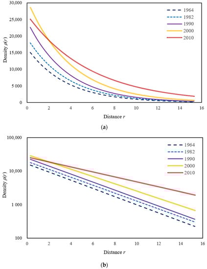 Comparing the gradients of population density decay in Hangzhou in different years (1964–2010). (a) Plot of urban density decay; (b) Semi-log plot for urban density decay.