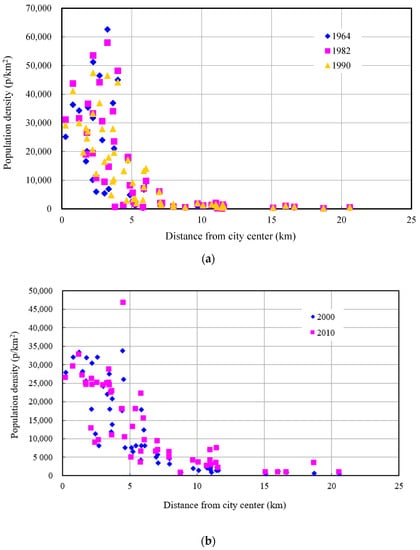 Population density by sub-district vs. distance from the city center in Hangzhou (1964, 1982, 1990, 2000 and 2010). (a) Population density vs. distance from the city center in 1964, 1982, and 1990; (b) Population density vs. distance from the city center in 2000 and 2010. Source: Data from Hangzhou’s Census Office. The data materials are as follows: (1) Manually Tabulated Data of the Second Population Census of Hangzhou, 1964; (2) Manually Tabulated Data of the Second Population Census of Hangzhou, 1982; (3) Manually Tabulated Data of the Second Population Census of Hangzhou, 1990; (4) Manually Tabulated Data of the Second Population Census of Hangzhou, 2000; (5) Manually Tabulated Data of the Second Population Census of Hangzhou, 2010.