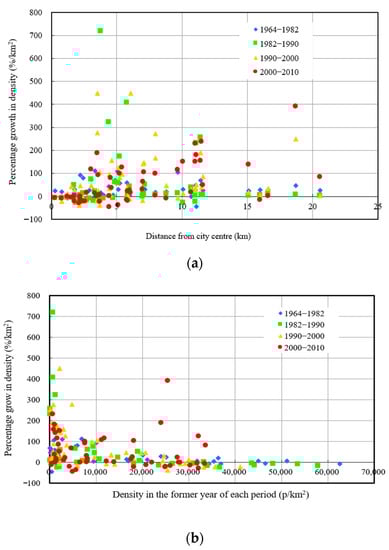 Restructuring of population density in Hangzhou (1964–1982, 1982–1990, 1990–2000 and 2000–2010). (a) The percentage growth in population density vs. the distance from the city center; (b) The percentage growth in population density vs. density in the former year of each period. Source: Data from Hangzhou’s Census Office (1964, 1982, 1990, 2000 and 2010).