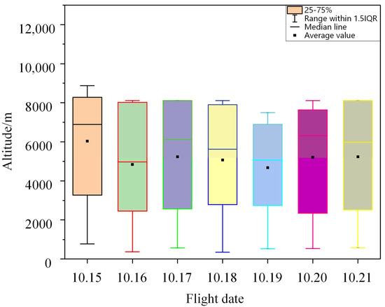 The actual schedule date is from 15 October 2019 to 21 October 2019 (a total of seven days) for a computational example. Figure 2 depicts the operating situation between hub nodes, the median line indicates that the Chengdu–Zhengzhou segment has a flight altitude of 5000 to 7000 m, and the average altitude is about 5000 to 6000 m. Except for October 19, the height and position of the quartile range are almost the same. According to the upper and lower limits of the box plot, except for slightly different altitudes of the flights on October 15 and October 19, the running situation of the flights on other schedule dates are almost the same. As mentioned above, the operating situation in Chengdu–Zhengzhou segment is relatively stable at the corresponding schedule date. In terms of collection and distribution, on the same schedule date, the light medium aircraft A320 is used, and for other cases (including the collection and distribution components and the segments that do not include the Chengdu–Zhengzhou segment and only includes the Chengdu or Zhengzhou node) the data is also stable. For details, please refer to the study [38] for analogy analysis.