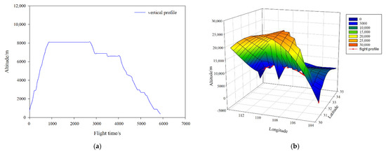 Figure 3 shows the flight profile on a typical day of A330-200 in Chengdu–Zhengzhou hub segment. Figure 3a denotes the two-dimensional vertical profile of the horizontal axis for flight time and the vertical axis for altitude. It is shown that the aircraft’s climb, cruise, and descent times are 871 s, 3257 s, and 1755 s, respectively, which provide a reference for the subsequent environmental impact analysis. Figure 3b depicts the overall situation of the aircraft on a typical day in the form of a three-dimensional flight profile graph, which is expressed by a red curve. Similarly, the two-dimensional vertical profile and three-dimensional flight profile in other cases are analogous.