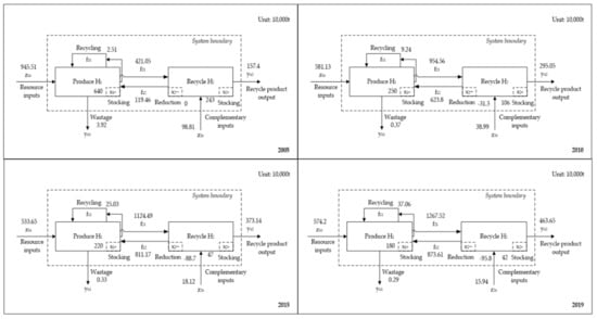 According to the results in Table 4, from 2005 to 2019, both y02 and f21 are increased, and the flow from H1 to H2 is increased by a net increase of 6,432,600 tons. The processing capacity of H2 is increased, x2+ has a downward trend, and the change in the amount of external input is large. Compared with 2005, the resource input z10 in 2019 has a net increase of 8.8031 million tons, indicating that the recycling of exhaust gas is highly dependent on external input. For the self-recycling of waste, f11 continues to increase, indicating that with the advancement of technology, the waste generation department has a relatively high capacity to treat its own waste.