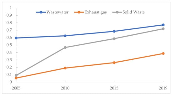 Due to the differences in the development foundations of the industrial symbiosis system and the different priorities of the industrial symbiosis system in different development periods, for different waste metabolism, although the industrial symbiosis ability has the same overall trend, it is at a development stage for different types of wastes. Based on the analysis of solid waste, the industrial symbiosis ability of the system has the fastest improvement from 2005 to 2010. Based on the analysis of wastewater, the industrial symbiosis ability of the system is slowly strengthened during the entire study period. Based on the analysis of exhaust gas, the industry symbiosis ability continues to rapidly increase throughout the study period.