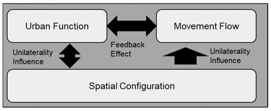 The objective of the research is to build a framework to model the three-dimensional relationship among density, land use, and accessibility in urban areas. The framework developed is based on the movement economics theory. The movement economics theory proposes that urban places “first generate the distribution pattern of movement flows, then it influences land-use selections, and these generate effects on movement with further feed-back on land-use selections and street-network as it leads to more rigorous urban expansion” []. Therefore, the theory cited the reciprocal effects of spatial structure (i.e., road network) (S), and movements of people (i.e., level of accessibility) (A), and the multiplier impacts on both (refer Figure 1 and Equation (1)). Additionally, it has indicated that there is a multiplicity of interconnections among urban structure (S), density (D), and land use (LU) (refer Equation (2)).