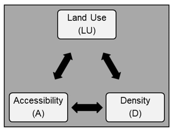 Nes et al. [] have explained that the density can be occurred as a function of accessibility. However, the density can be changed with the respective land use. Accordingly, this research hypothesizes that there is a three-dimensional relationship among density, accessibility, and land use in urban areas as depicted in Figure 2.
