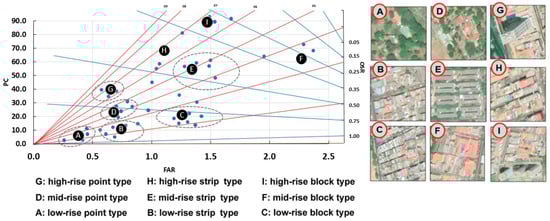 Bi represents the gross floor area (m2) of the building i, Fi represents the number of floors of the ith building, and A represents the area of the zone under computation. Space matrix is a method to measure and present comprehensive ideas of the urban form density []. Space matrix utilizes 9 density categories based on the GSI, FAR, and L (refer Figure 3). The physical nature of these 9 categories is presented by google images on the right side of the Figure 3.