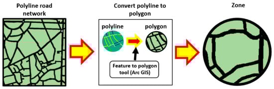 The preparation of analysis zones was the first step of the data preparation process of the study. Lu et al. [] have utilized natural road blocks to develop analysis zones. The same method has been followed in this study, where polyline road network of major roads (A and B classes) was utilized for this purpose. The key steps are indicated in Figure 4. The first step of the figure depicts the condition of the main road network. Natural zones in the study area were demarcated based on the road segments. As the second step, the polyline road segments were converted to polygons by utilizing the tool (feature to polygon) in the geographic information system (GIS) environment. Output of the tool provides natural road block polygons (zones) layer created by joining the corresponding segments of the natural road blocks. Density, land use, and accessibility data preparation was based on the demarcated zones.